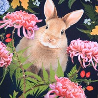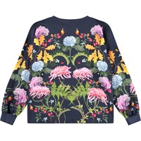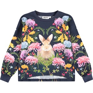 Dark blue long-sleeved top made of soft organic cotton with ribbed cuffs and neckline. The long-sleeved top has a loose fit and is longer at the back. The long-sleeved top has a print of a rabbit surrounded by colorful flowers.