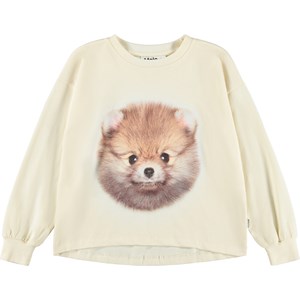 Off-white long-sleeved top made of soft organic cotton with ribbed cuffs and neckline. The long-sleeved top has a loose fit and is longer at the back. The long-sleeved top has a print of a cute Pom dog in golden colors.