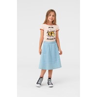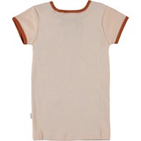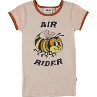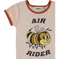 Rhiannon is a rose coloured ringer t-shirt with brown edges at the neck and sleeves. On the front, there is a print of a bee and the text 'Air rider'.