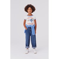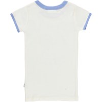 Rhiannon is a white ringer t-shirt with a humorous print of the moon and Earth swinging each other around. The t-shirt has a blue edge tape.