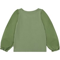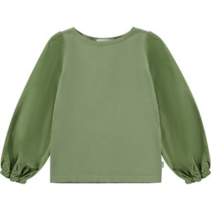 Green top with puff sleeves in cotton poplin. This top is in 100% cotton, has a round neck with a rib edge, long puff sleeves with elastic at the bottom and is in a regular fit.
