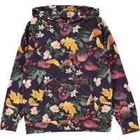 Rhona is a hoodie with long sleeves and a pouch pocket on the front. The hoodie is purple with a print of colourful blackberries.
