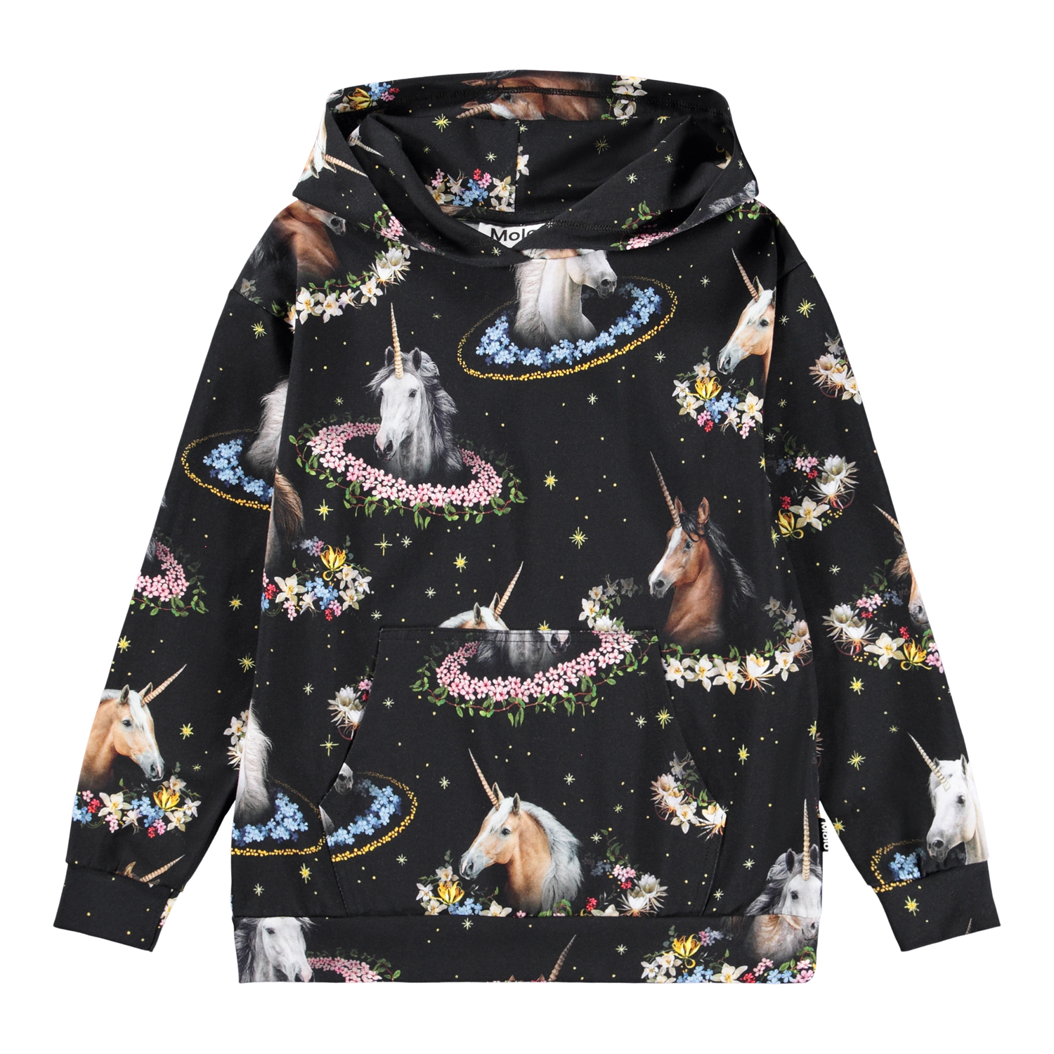 Black hoodie made of soft, organic cotton with a print of pegasi with colorful flower wreaths. The hoodie has a loose fit, a kangaroo pocket and long sleeves with ribbed cuffs and waist edge.