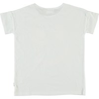Ribila light and airy white t-shirt in organic cotton. It has a print of a coral coloured smiley face with palm tree eyes on the front.