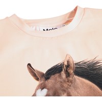 Pink, loose T-shirt made of soft organic cotton with a round neckline and a longer back. The T-shirt has a charming print of a brown horse.