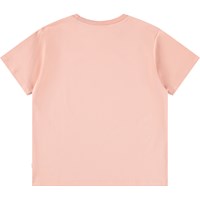 Pink short-sleeved T-shirt made of soft organic cotton with a ribbed neckline. The T-shirt has a loose fit and a print on the front of a melting smiling face.