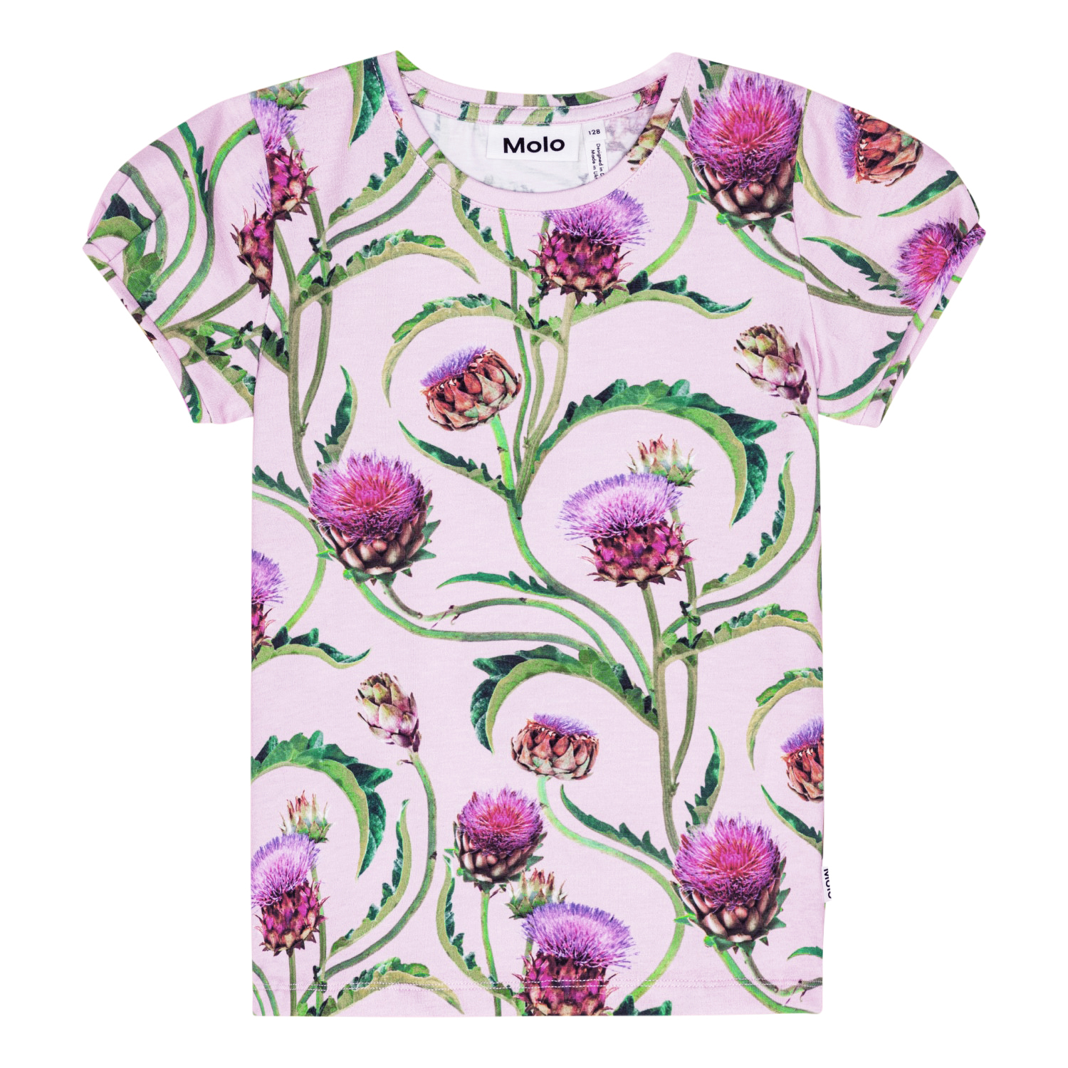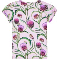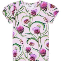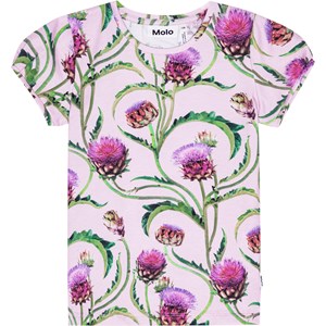 Snug, purple t-shirt in organic cotton. It has an all over print with artichoke flowers in shades red, purple and green. The t-shirt has small, short puff sleeves and a round neck.