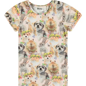 Pink fitted t-shirt in soft organic cotton with a round neck and small short puff sleeves. The T-shirt features an all-over print of cute animals with flower garlands.