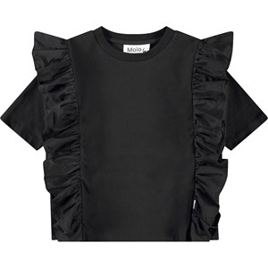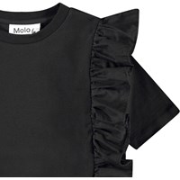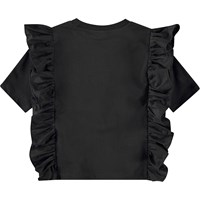 Black t-shirt in soft organic cotton with ribbed neckline. The t-shirt has a loose fit and ruffle detail that runs over the shoulder and on the front and back.