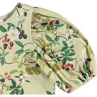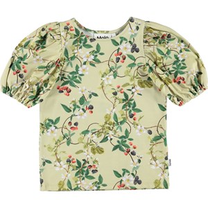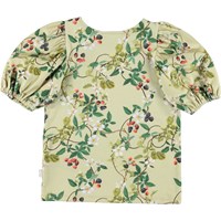 Rivera is a top with puff sleeves in light green and with a print of blackberries. The top has a round neck and an elastic edge at the sleeves that helps them sit perfectly.