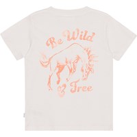 White, organic t-shirt with a horse print on the chest. The t-shirt has a great fit and a round neck with a rib edge. There's an orange print of a wild horse with 'Be Wild and Free' on the back.