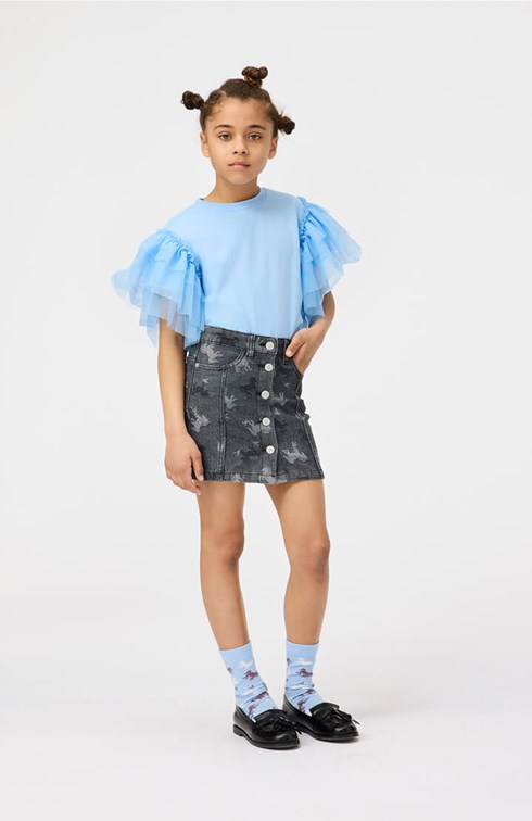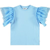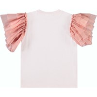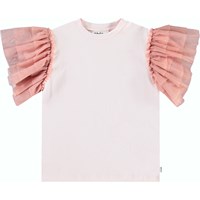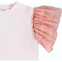 Pink t-shirt in soft organic cotton with ribbed neckline. The t-shirt has a loose fit and 3 layers of tulle sleeves that drape nicely over the shoulder.