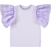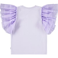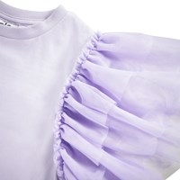 Purple T-shirt made of soft cotton with a ribbed neckline. The t-shirt has a loose fit and 3 layers of tulle sleeves, which fall nicely over the shoulder.