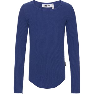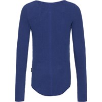 Long sleeve, blue top in a soft, organic cotton in durable rib knit. The top is snug and has a round neck. It has raw edges on the sleeves and thumb holes. There's vertical stitching at the centre back as well as a rounded hem.