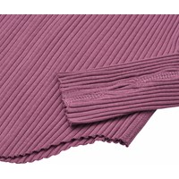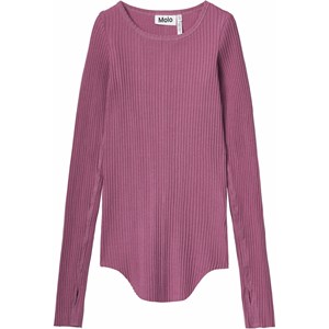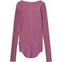 Purple long-sleeved top in stretchy organic cotton rib with a close fit, round neckline, raw edges on both sleeves with thumb holes. Long-sleeved top has a vertical seam down the middle of the back and a raw, rounded edge at the bottom.