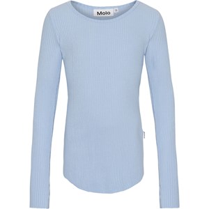 Rochelle is a rib top with long sleeves in light blue. It has a slightly longer hem in the front and back as well as raw edges at the sleeves and bottom. Rochelle has a slim fit that makes it perfect to wear alone or under another style.