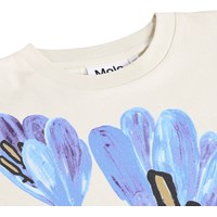 White T-shirt made of organic cotton with short sleeves and ribbed neckline. The T-shirt has a loose fit with a print of blue flowers.
