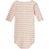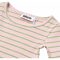 Pink and green striped t-shirt in soft organic cotton rib with a round neck. The t-shirt is fitted with a vertical seam down the middle of the back and a raw rounded edge at the bottom.
