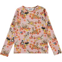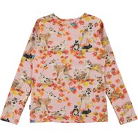 Rose is a long sleeve pink top with an all-over print of deer and rabbits among golden leaves. The top has a round neck.