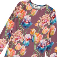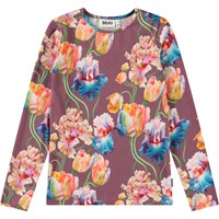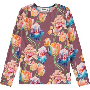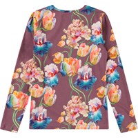 Purple long-sleeved top in organic cotton with a round neck. The top is fitted with a colourful all-over print of artistic tulips.