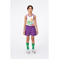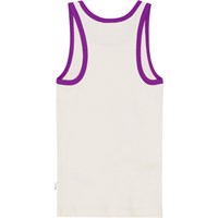 Snug, white tank top in organic cotton. It has a purple edge tape around the neck and armholes, and it has a graffiti print with mulit-coloured hearts printed on the front.