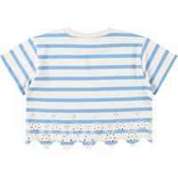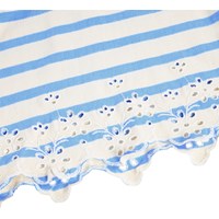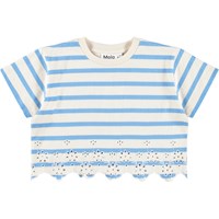 Cropped T-shirt made of soft, organic cotton with blue and white stripes, round neckline and ribbed edge. It has a loose fit and is finished with broderie anglaise along the bottom.