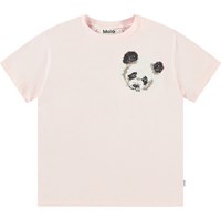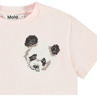 Pink t-shirt in organic cotton with short sleeves and ribbed neckline. The t-shirt has a loose fit and a sequin embroidery of a panda on the chest.
