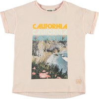 Rozinda is a rose-coloured t-shirt with a print of cliffs and a shore with the text 'California'. The t-shirt has roll up sleeves and is in 100% cotton. Certified by Ecocert Greenlife, certification no. 197496.
