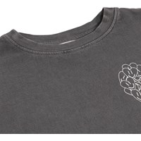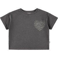 Grey cropped T-shirt made of organic cotton with short sleeves and ribbed neckline. The T-shirt has a loose fit with a heart print on the front and the text Love.