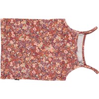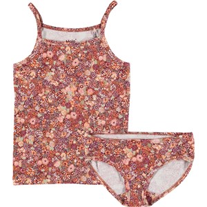 Underwear set with a top and knickers in red with a print of small flowers. The set comes in a small, sweet bag.