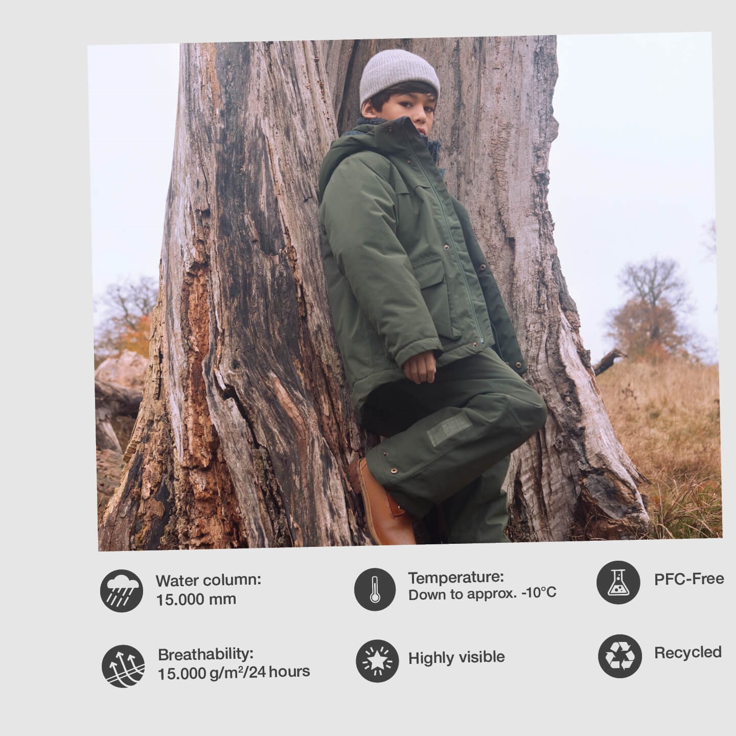 • The outerwear has a high water column level which is achieved by the durable shell fabric, taped seams, protected zippers and the PFC-free water- and dirt-repellent coating.