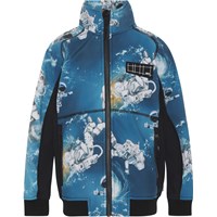 Cloudy is a sporty, waterproof softshell jacket in blue with a print of astronauts. Cloudy has a zip front, side pockets and wind cuffs at the sleeve openings. It has an elastic edge at the bottom. Molo's softshell jackets are perfect for transitional weather because the outer fabric is waterproof, windproof and breathable. The lining and inner flining are recycled and made of recycled polyester. This product has a water-resistant, PFC-free surface treatment (Does not contain, e.g. PFOS, PFOA, etc). Water column pressure: 8.000 mm. Breathable: 5.000 g/m2/24hr.