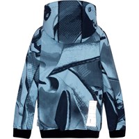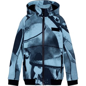Functional, blue softshell jacket, partially constructed in recycled polyester with an all over enlarged skateboard print. The jacket has an inner fleece lining, a front zip closure with chin protection and with an inner flap and a detachable hood. It has zip pockets at the sides and a large reflector on the back. There is black elastic rib at the sleeves and waist to keep the cold air out. The jacket is easy to move around in and has a moderate level of waterproofing and breathability, which makes it great for different types of weather and outdoor activities. The jacket has been treated with a water and dirt-repellent coating that does not contain chemicals like PFOS, PFOA, etc. Water column pressure: 5.000 mm. Breathability: 5.000 g/m²/24hrs.