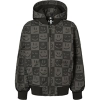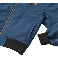 Blue water-repellent bomber jacket with detachable hood, soft fleece lining, and ribbed cuffs at the sleeves and bottom. The jacket has a front zip closure, practical front pockets, and a cool dinosaur print on the back as well as an embroidered badge on the chest. Ideal for transitional weather and active play.