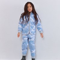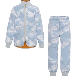 Hatton is a lightly insulated thermal set in a sky print with an inner contrast colour in golden yellow. The jacket has rib at the neck and sleeves, and it has Molo's iconic star reflector on the back to keep a child extra visible in the dark. The trousers have elastic at the waist, rib at the ankles and a reflector star on the back of one leg. The trousers also have matching reinforcements at the knees and seat, which makes them extra durable for all types of play and activities.