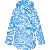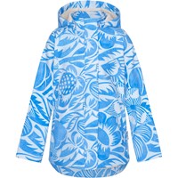 Functional softshell jacket partially constructed in recycled polyester with a blue all over print of artistic leaf and floral silhouettes. The jacket has a front zip closure with wind placket and chin protection. It has a detachable hood, slanted zip pockets at the sides and a large reflector on the back. The jacket has a soft fleece lining and elastic at the waist to adjust the silhouette and fit. The jacket is easy to move around in and has a moderate level of waterproofing and breathability, which makes it great for different types of weather and outdoor activities. The jacket has been treated with a water and dirt-repellent coating that does not contain chemicals like PFOS, PFOA, etc.