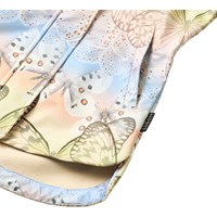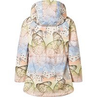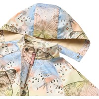 Wind and water-repellent jacket made from recycled polyester with fleece lining and a beautiful butterfly print in soft pastel tones. The jacket has a detachable hood, hidden side pockets, chin guard, and an adjustable inner elastic around the waist. It has a longer fit at the back that goes down over the bottom, providing extra protection in wet weather.