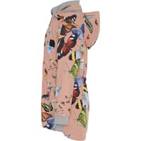 Hillary is a parka-inspired softshell jacket in pink with a butterfly print. The jacket has an elastic waist, detachable hood, a front zip and an elastic edge at the sleeves. It has Molo's iconic star reflector on the back. Molo's softshell jackets are perfect for transitional weather because the fabric is waterproof, windproof and breathable. This product has a water resistant, PFC-free surface treatment (Does not contain, e.g. PF OS, PFOA, etc). Water column pressure: 8.000 mm. breathable: 3.000 g/m2/24hr