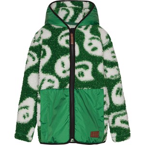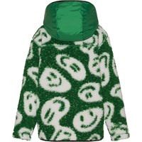 Green fleece jacket with an allover print of white smiley faces. The jacket features a front zipper, hood, and large front pockets. The fleece jacket provides insulation and can be worn on its own or as an additional layer under outerwear on the coldest days.