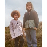 Light pink fleece jacket with a smiley design, front zipper, hood, and large pockets. The fleece jacket provides insulation and can be worn on its own or as an extra layer under outerwear on the coldest days.