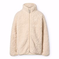 Off-white fleece jacket in recycled polyester with a nice back patch in durable nylon. The jacket has a smooth cotton lining, off-white ribbed edges, high collar, zip closure, and a thumb hole.