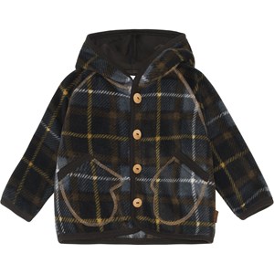 Uli is a brown plaid baby fleece jacket with a hood. The jacket has light coloured stitching, glove-shaped front pockets and a button front closure.
