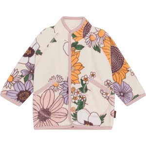 Floral fleece jacket for smaller children with glove-shaped pockets and button closure on the front. The fleece jacket provides insulation and can therefore be used on its own or as an extra layer under outerwear on the coldest days.