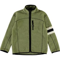Urbano is a khaki green fleece jacket with black stitching and a zipper. It has a single chest pocket with a zip closure and a striped band down one sleeve. Molo's fleece jackets are warm and keep you insulated from the cold. Wear it alone or, on very cold days, as an extra layer under another jacket.