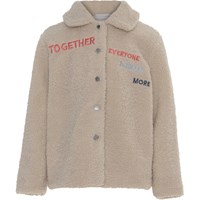 Uri is a beige fleece jacket with a collar and a button closure on the front. The jacket has an embroidered text on the front. Uri is a perfect transition jacket.