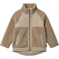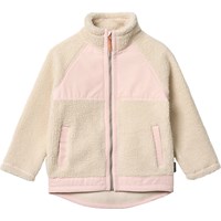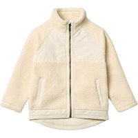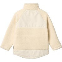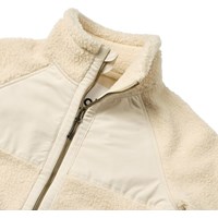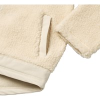 Off-white fleece jacket made from recycled polyester with front pockets and durable details. The jacket has a loose fit, a high collar, a zip with chin guard, and is longer at the back.