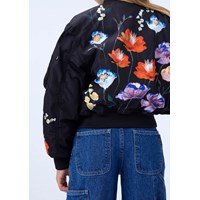 Black bomber jacket with a colourful floral print made from recycled polyester. The bomber jacket has a regular fit, front pockets, a zip pocket on the sleeve, practical zip closure with wind flap, and ribbed edges at the neck, cuffs, and hem. Furthermore, the jacket has a recycled polyester filling that provides smooth softness and optimal thermal insulation, and the water-repellent surface is free from PFOS and PFOA.