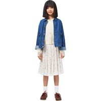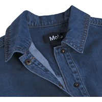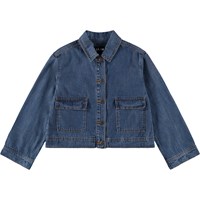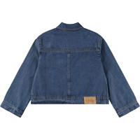 Blue classic denim jacket made of soft viscose and cotton blend in a loose fit. The jacket has large front pockets with flaps, button closure at the front, and a small leather label with a logo on the back. A versatile and timeless style for everyday use. The smallest sizes (92–134) have a snap buttons, while sizes 140–176 have a classic jeans button.