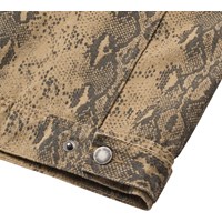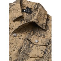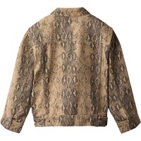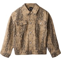 Brown denim jacket made of cotton with snake print. The jacket has a loose fit, a shirt collar, button closure at the front, side pockets, chest pockets, and adjustable snap buttons at the back. From size 92-134, the jacket is delivered with snap buttons, making it easier for children to close the jacket themselves. From size 140-176, the jacket is delivered with a regular button closure.