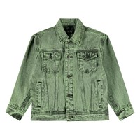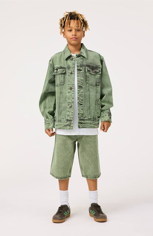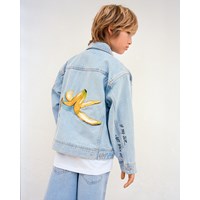 Light blue denim jacket in cotton with a banana peel embroidery on the back and the text on the sleeve "If you slip.... Get back up". The jacket has a loose fit, shirt collar, button closure at the front, side pockets, chest pockets, and adjustable snap buttons at the back. From size 92-134, the jacket comes with snap buttons, making it easier for children to close the jacket themselves. From size 140-176, the jacket comes with a regular button closure.